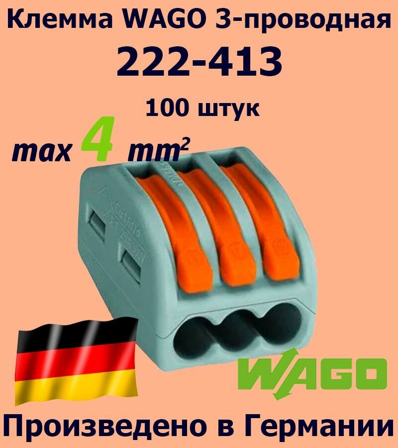 Клемма WAGO.222-413 без пасты для медных проводов 3х0.08...4мм.кв. оригинал ( 1 упаковка )- 50шт