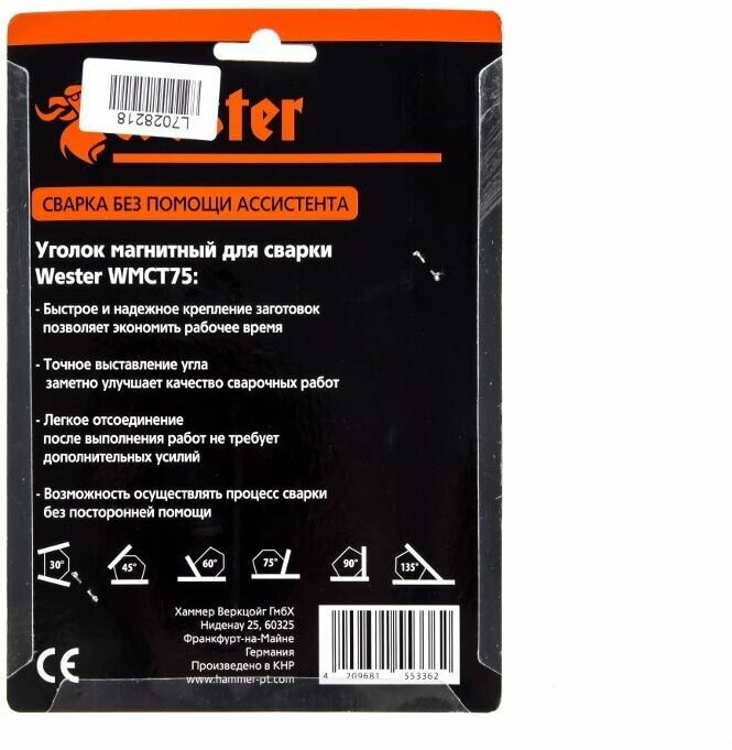 Магнитный уголок для сварки Wester WMCT75 829-007, углы 30 , 45 , 60 , 75 , 90 , 135