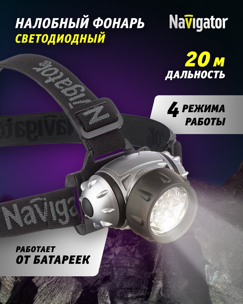 Фонарь налобный Navigator 94 916 NPT-H04, работает от батареек 3ААА