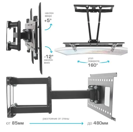 | Плюсы: | Надежный, дюбеля 10х60, 6 штук. Две оси поворота телевизора + сдвиг.
