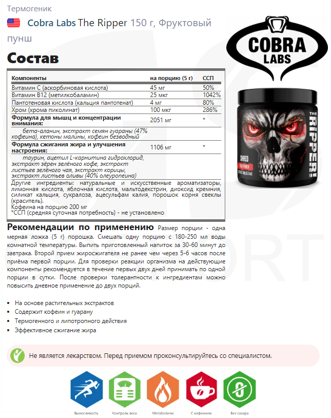 СохранитьЖиросжигатель Cobra The Ripper! (150 г) Фруктовый пунш интересное: