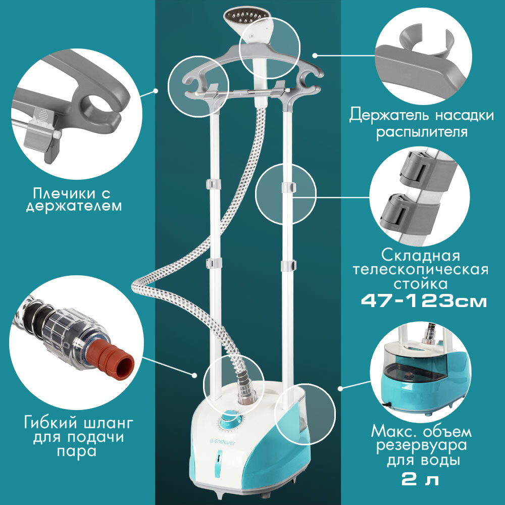 ENDEVER Отпариватель Endever Odyssey Q-505, напольный, 2000 Вт, 2 л, 85 г/мин, бело-голубой