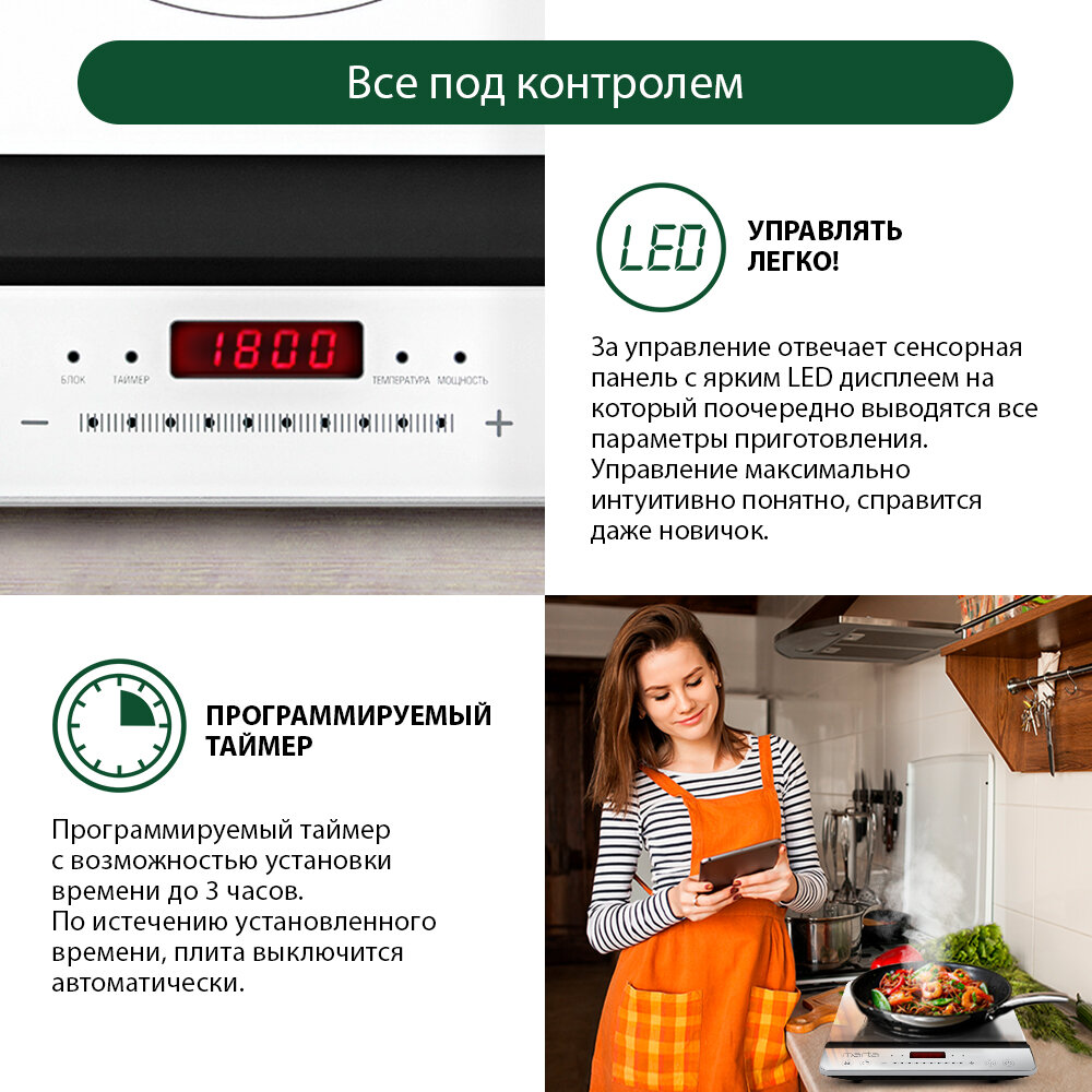 | Отзыв: | Купила плитку пару месяца назад. Красивая, приятного белого цвета, и на столик в небольшой кухне подошла идеально. Разогревается быстро, пользоваться легко интерфейс понятный ни чего лишнего, и мыть просто. Правда думала белый цвет, трудно будет отмыть, на самом деле всё легко. К сенсорным кнопкам не сразу привыкла, цифры на дисплее хорошо видно, рекомендую. |