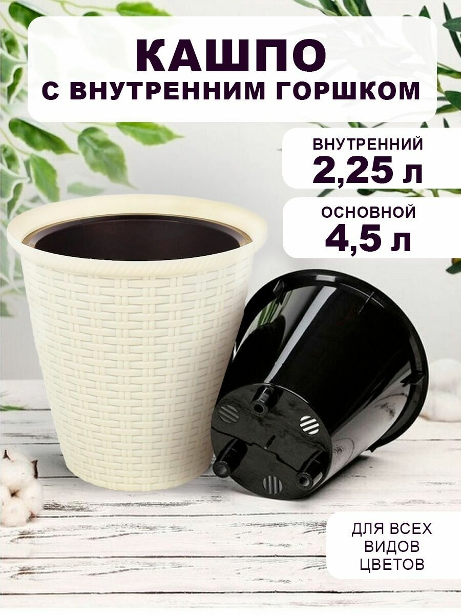 Кашпо Rattan диаметр 21 см 4,5 л с внутренним горшком 2,25 л сливочный InGreen