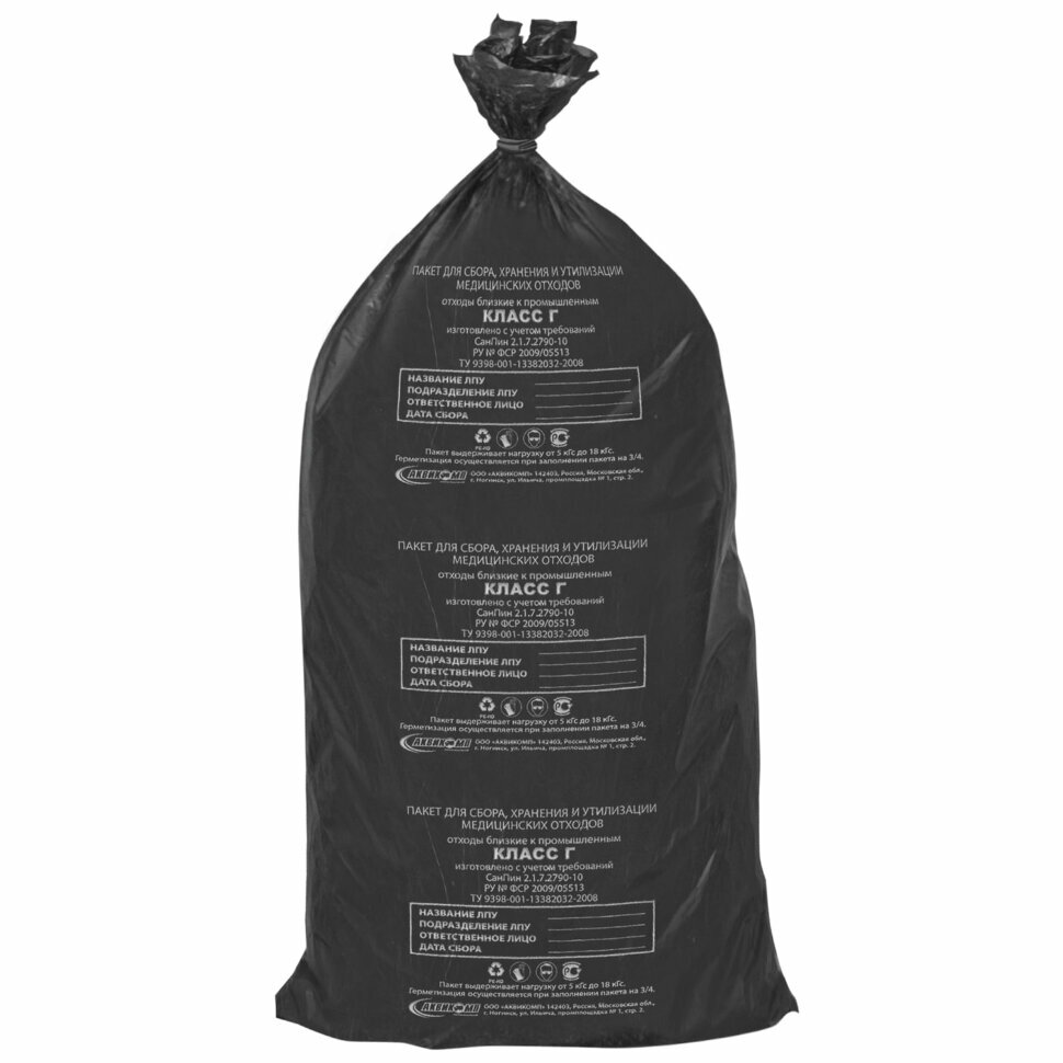 Пакеты для мусора медицинские Аквикомп, класс Г (100л, 60x100см, 15мкм, черные) 20шт. (104678)