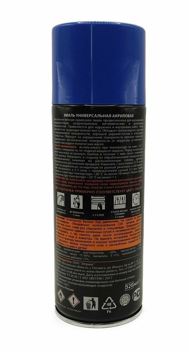 Эмаль универсальная акриловая SKYRON, синяя (RAL 5005), 520 мл.