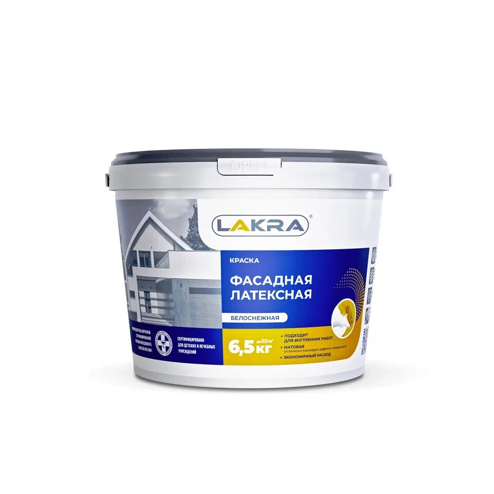 Краска Лакра акриловая фасадная суперстойкая, белоснежная 6,5 кг
