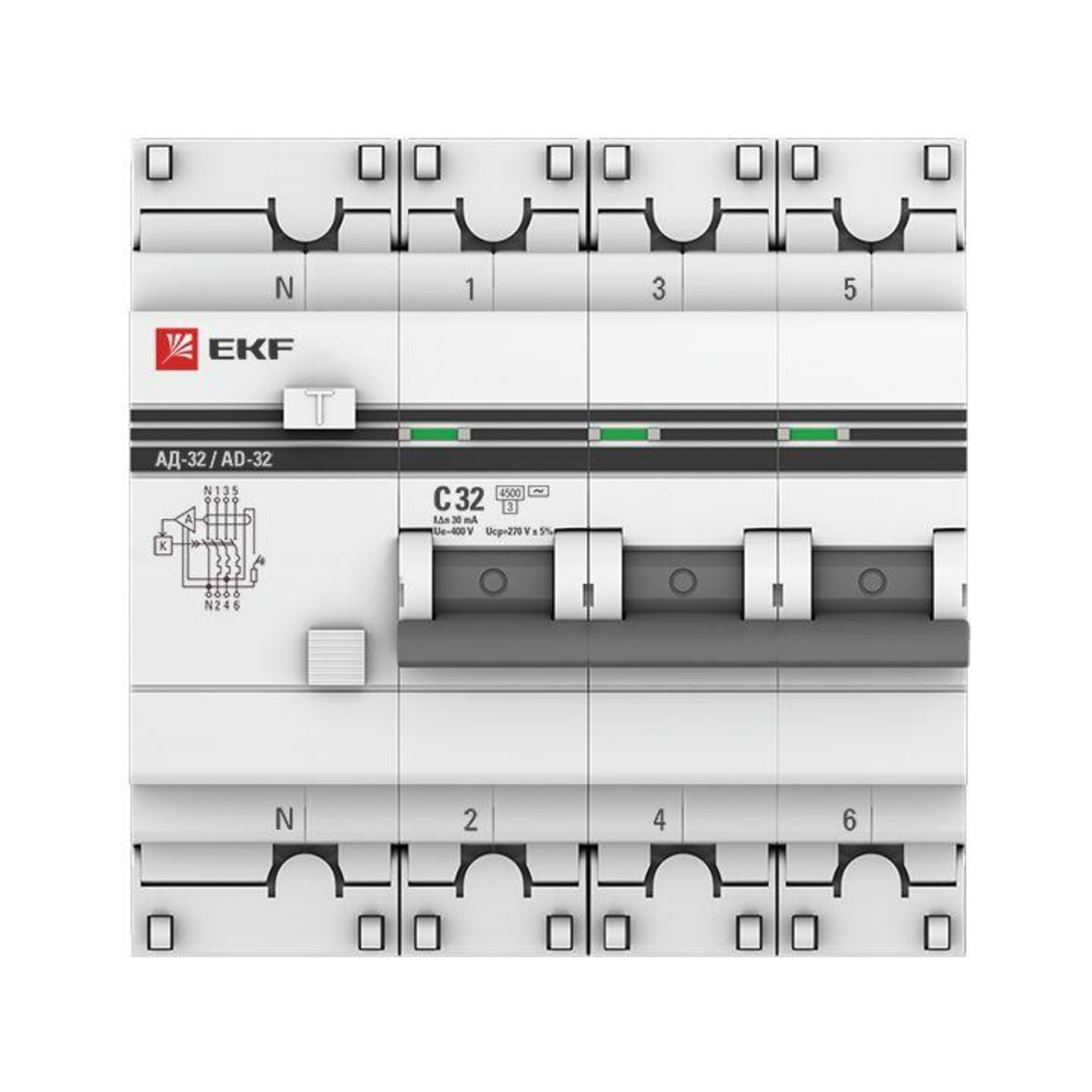 Выключатель автоматический дифференциального тока 3п+N C 32А 30мА тип AC 4.5kA АД-32 PROxima, EKF DA32-32-30-4P-PRO (1 шт.)