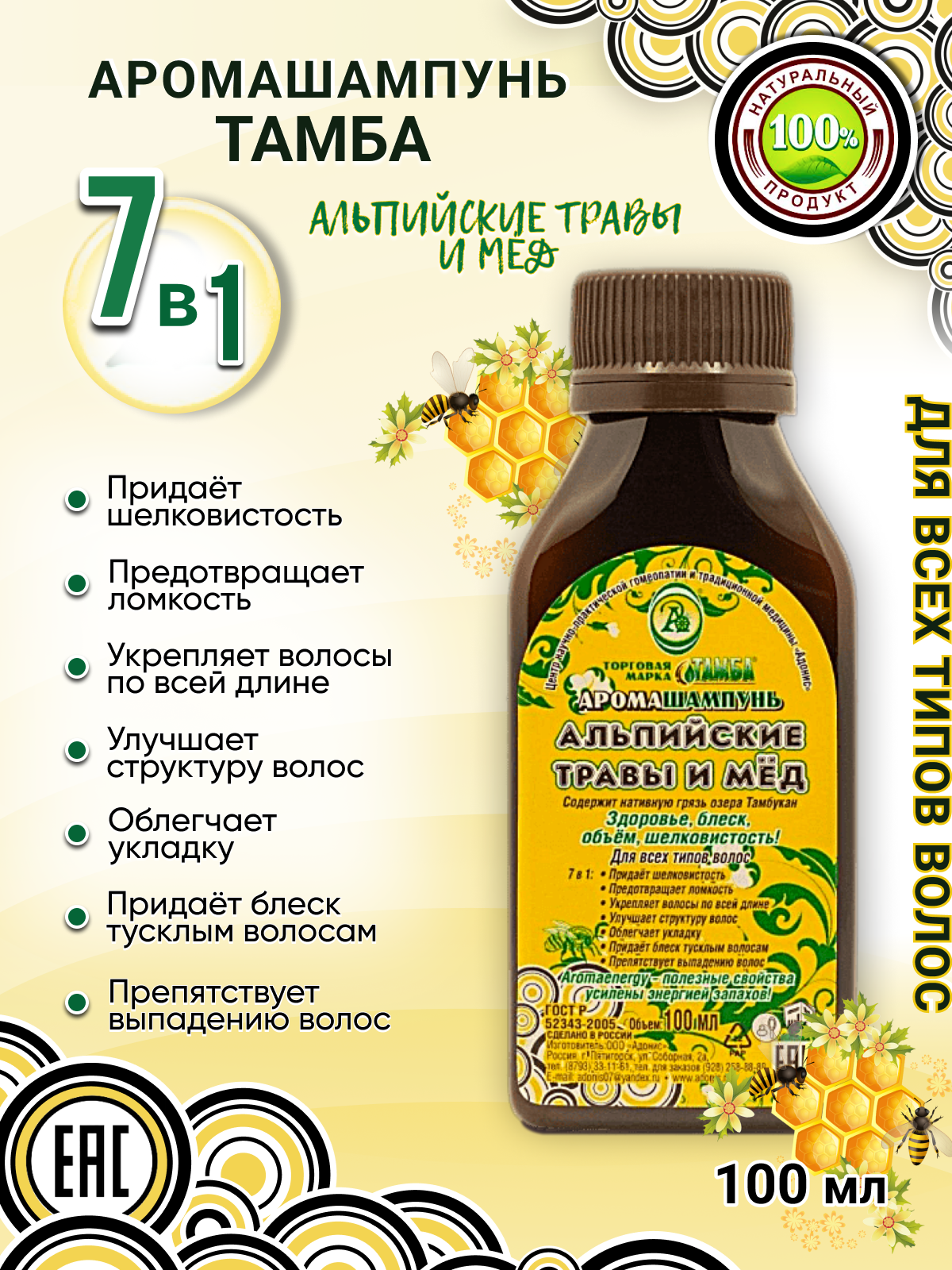 Шампунь для всех типов волос Тамба Альпийские травы и мед, укрепляющий, восстанавливающий, не содержит сульфатов и парабенов,100мл