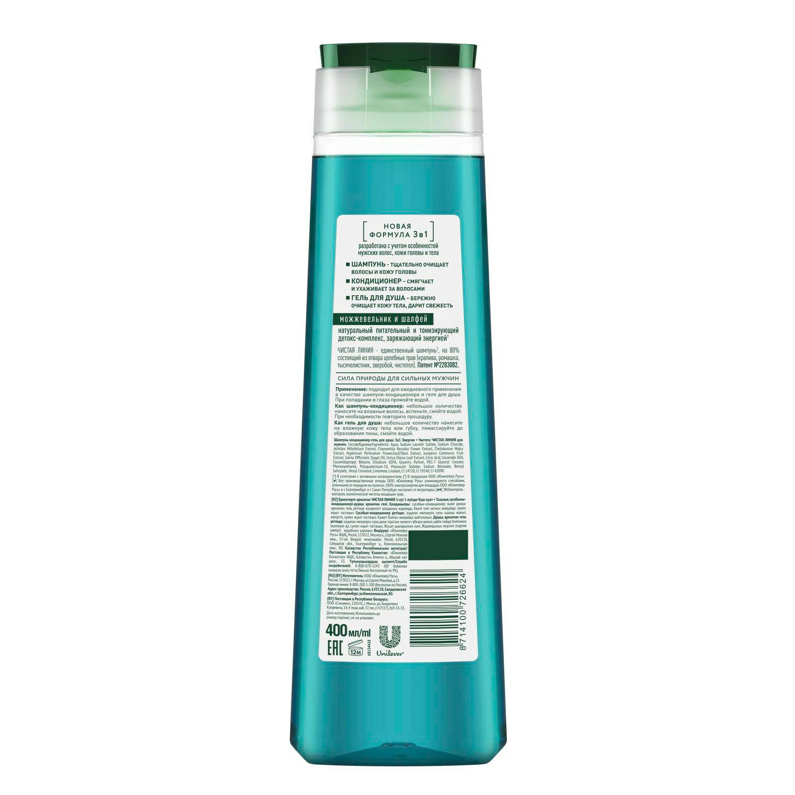 Купить Гель для душа и шампунь с кондиционером Чистая Линия Men Энергия и чистота 3в1, 400мл