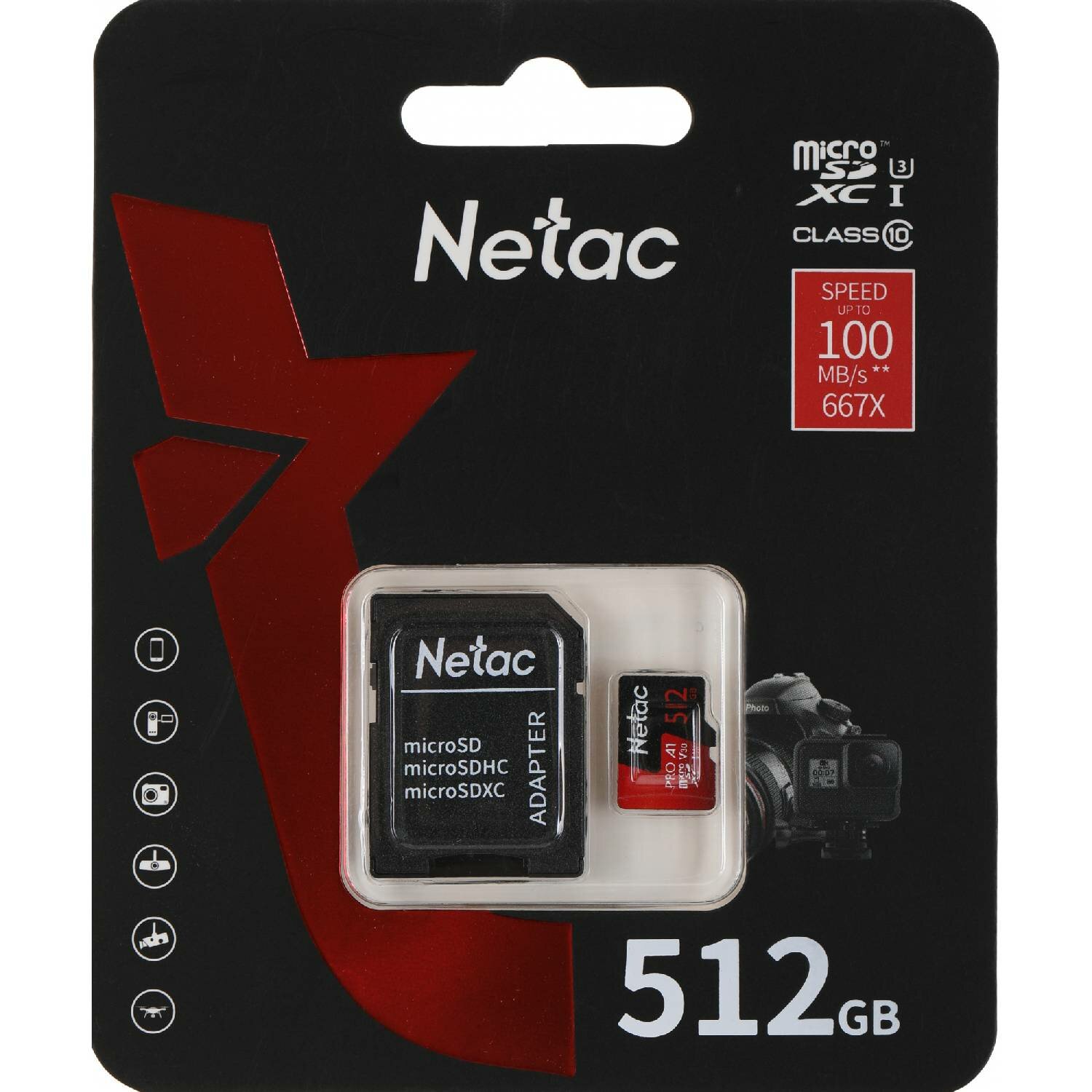 Карта памяти microSDXC UHS-I U3 NETAC P500 Extreme Pro 512 ГБ, 100 МБ/с, Class 10, NT02P500PRO-512G-R, 1 шт., переходник SD