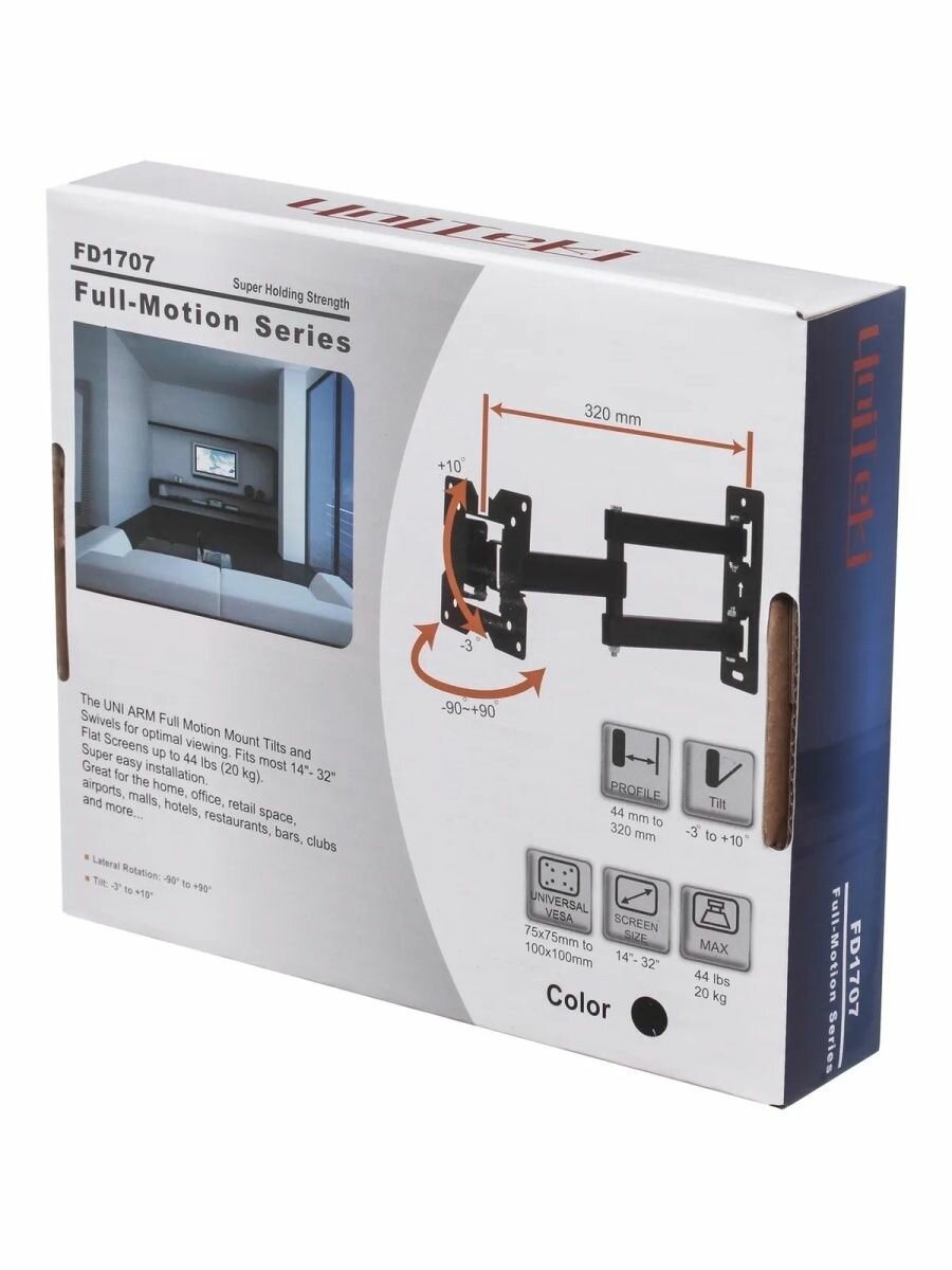 UNITEKI Кронштейн на стену наклонно поворотный двухколенный для телевизора UNITEKI FD1707 (черный)