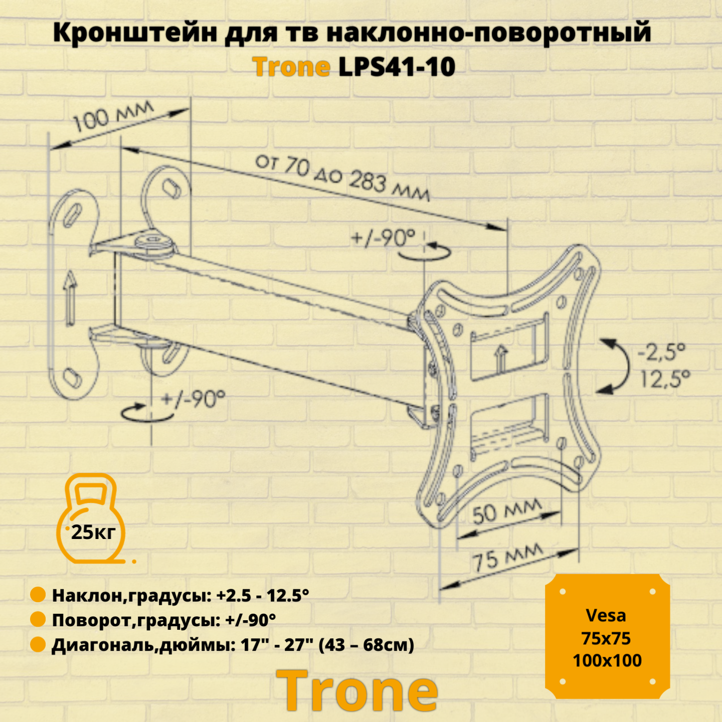 Кронштейн Trone LPS 41-10, для ТВ, наклонно-пов, 17"-23", до 25 кг, 280 мм, чёрный