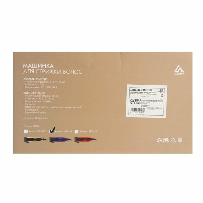 Машинка для стрижки Luazon LTRI-14, 15 Вт, 3/6/9/12 мм, 220 В, синяя Luazon Home 2810428 .