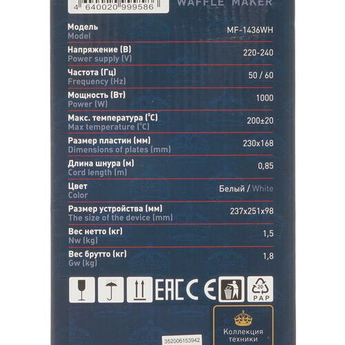 Ниже Вы можете прочитать отзывы на Вафельница MAUNFELD MF-1436WH 1000Вт белый, ознакомится с подробными характеристиками, посмотреть интересные обзоры и фотографии на Вафельница MAUNFELD MF-1436WH 1000Вт белый.