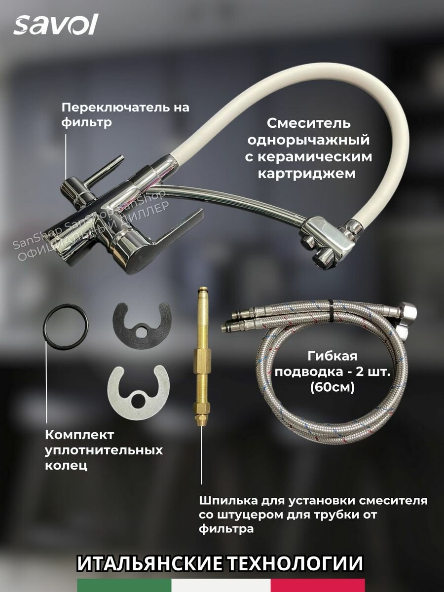 Смеситель Savol S-L1805-02 для кухни, с подключением к фильтру, цвет хром / белый