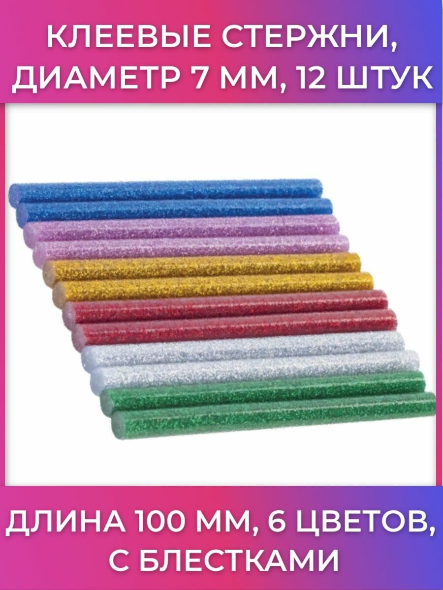 Клеевые стержни, комплект 12 шт., диаметр 7 мм, длина 100 мм, цветные (ассорти), С блестками, 6 цветов, BRAUBERG, 670319