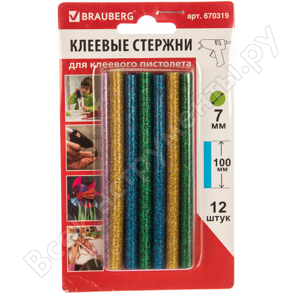 СохранитьКлеевые стержни, диаметр 7 мм, длина 100 мм, цветные (ассорти), с блестками, комплект 12 шт., BRAUBERG, 670319 интересное: