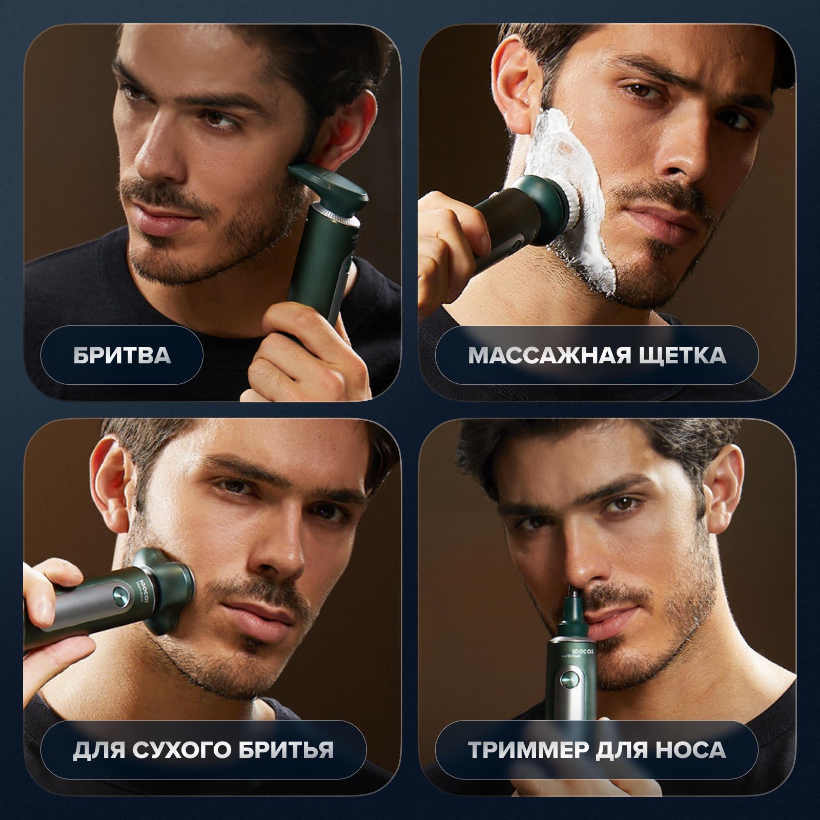 Электробритва Soocas S5 Dark Green (Глобальная версия), 4 насадки, триммер для носа, триммер для бороды, бритва, массажная щетка, зеленый, серый