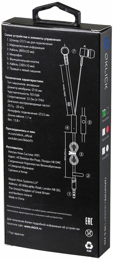 Гарнитура Oklick HS-S-220, 3.5 мм, вкладыши, черный [d2b]