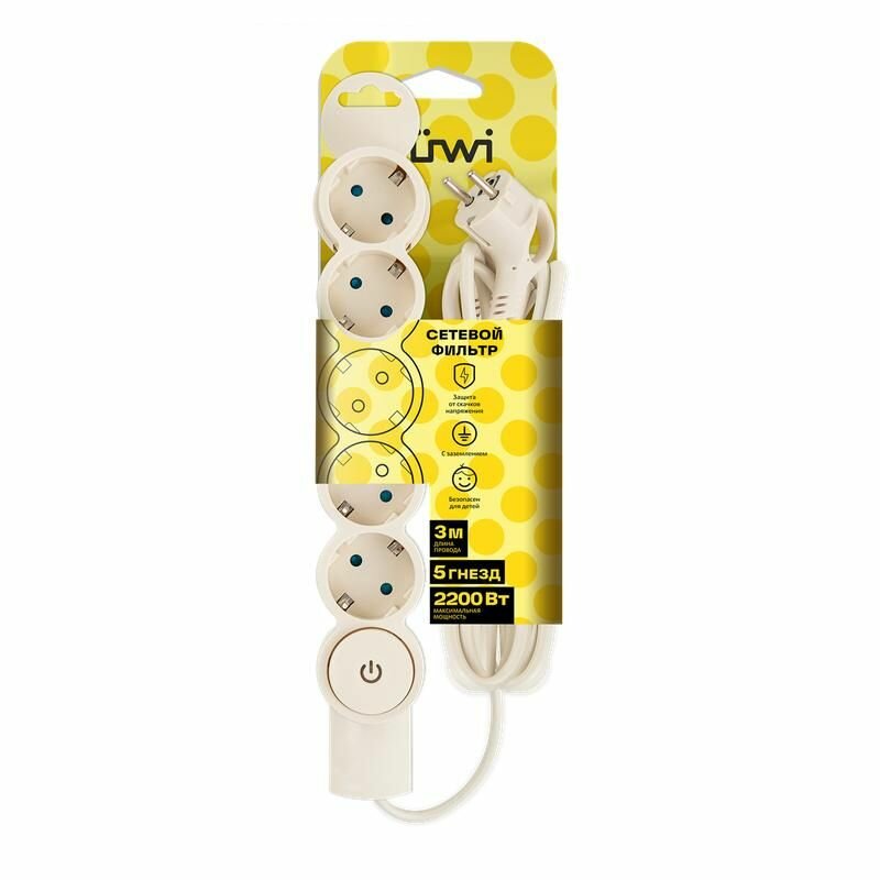 Фильтр сетевой duwi 5 гнезд с выключателем с заземлением 10А/2,2кВт 3м слоновая кость