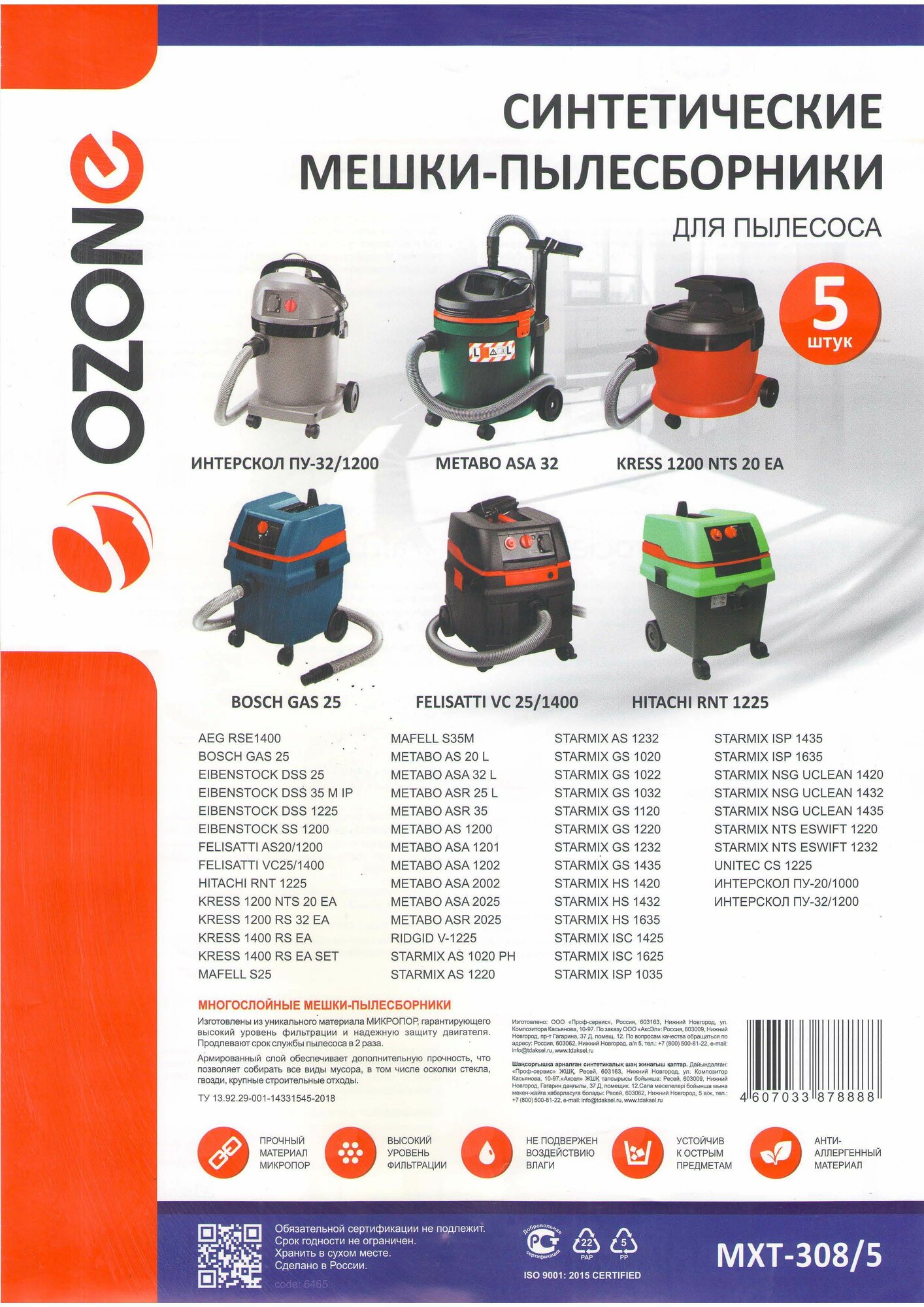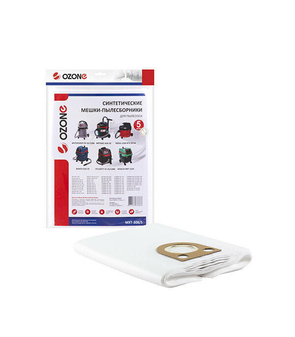Ozone Мешки для пылесоса BOSCH GAS 25, KRESS 1400, ИНТЕРСКОЛ ПУ-32/1200, STARMIX FB20/25/35, AEG, FELISATTI, HITACHI, METABO, 5 шт., синтетические, не боятся мокрой пыли, Ozone MXT-308/5