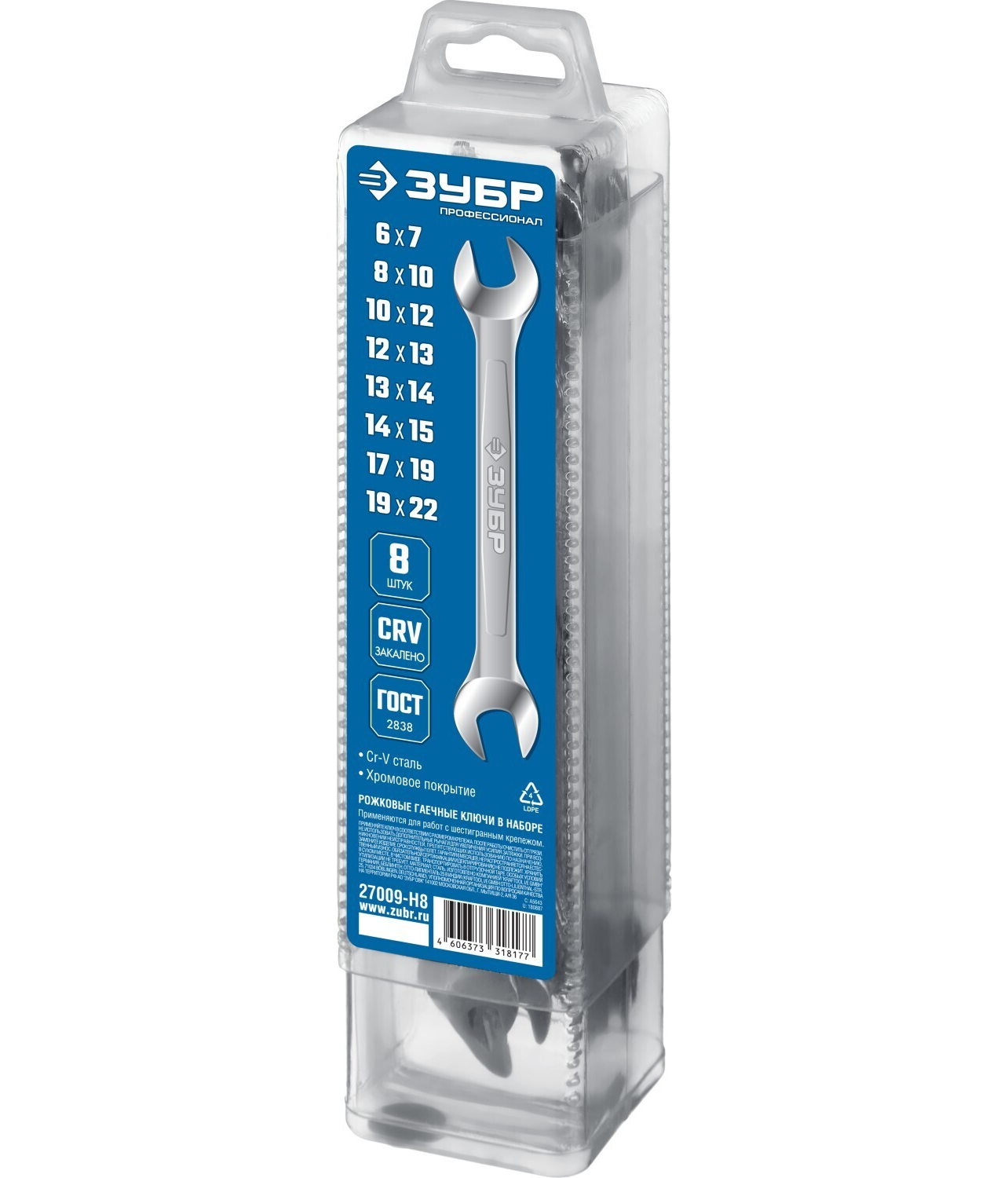 Набор рожковых гаечных ключей 8 шт, 6 - 22 мм, Зубр 27009-H8 .
