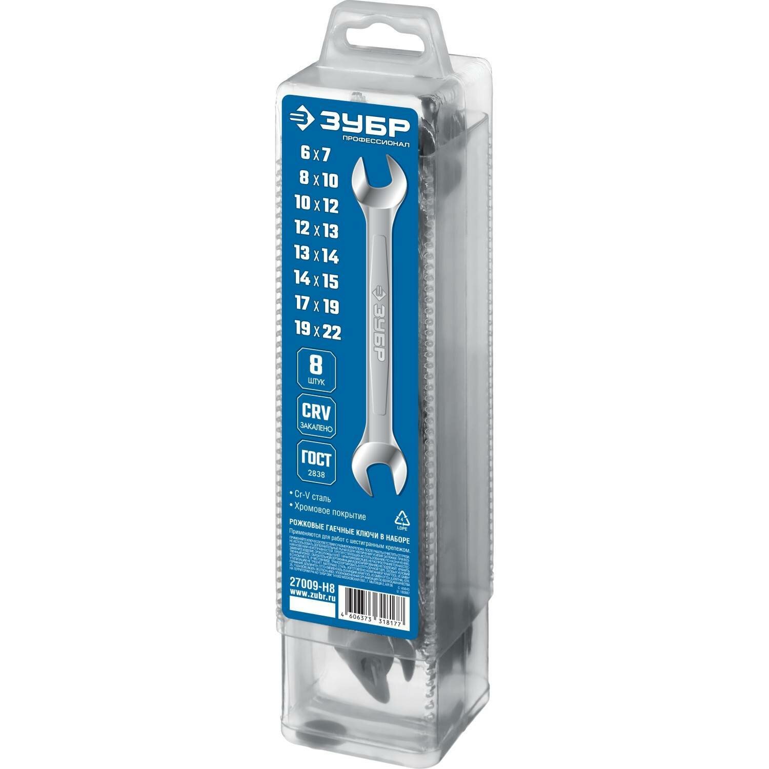 Набор рожковых гаечных ключей ЗУБР 8 шт, 6 - 22 мм, 27009-H8