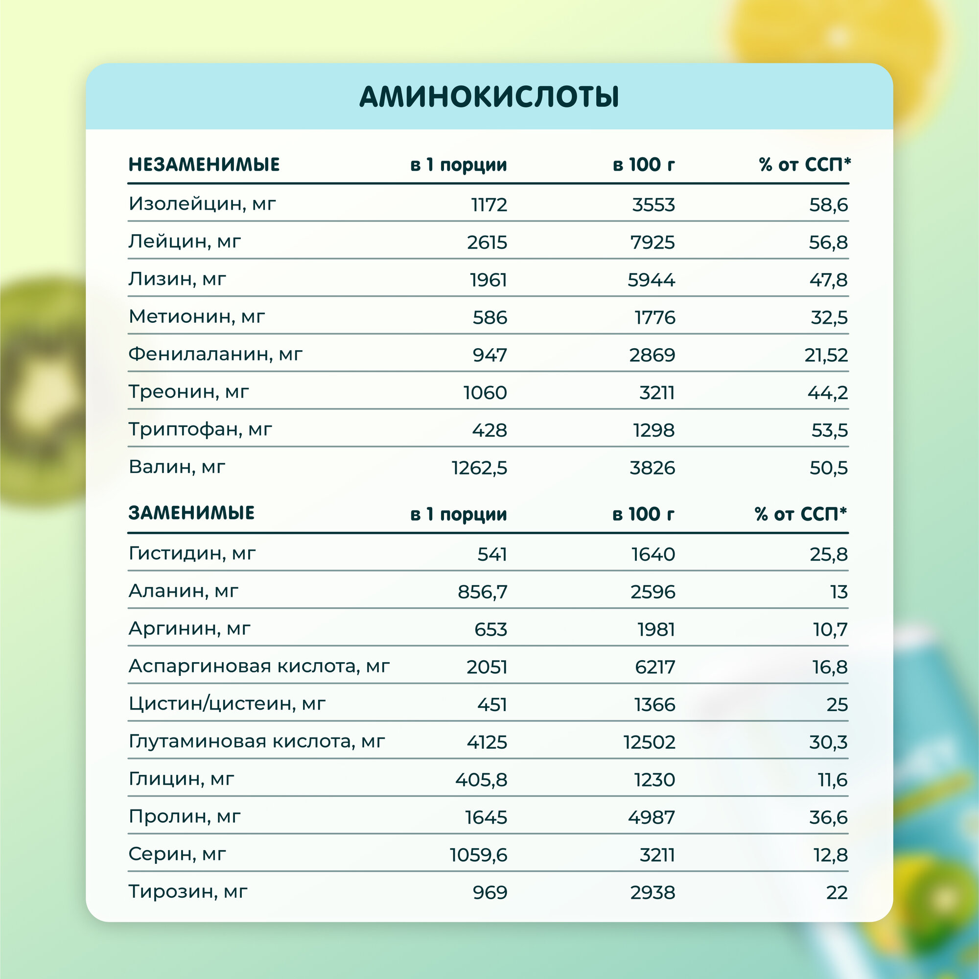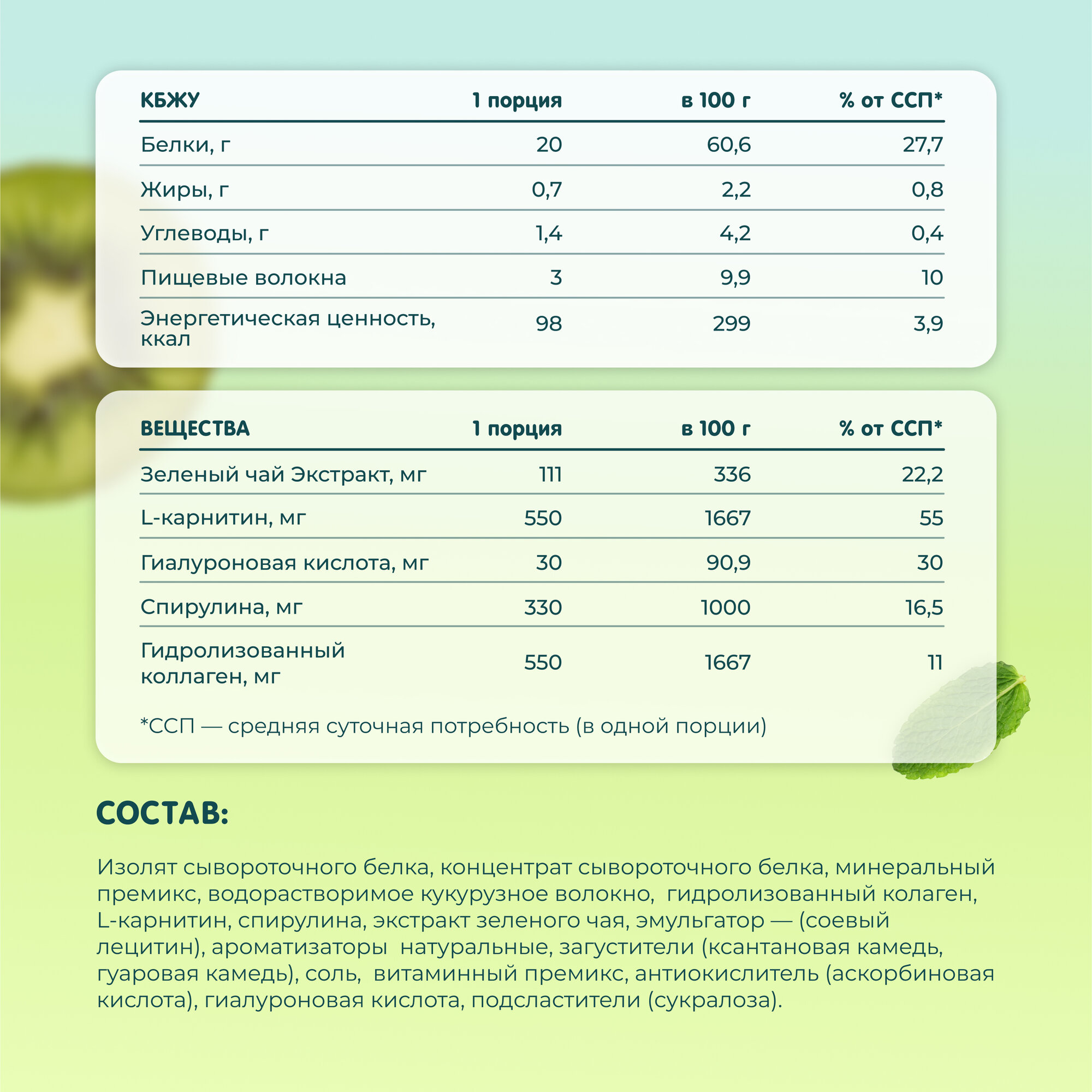 | Состав | изолят сывороточного белка, концентрат сывороточного белка, минеральный премикс, водорастворимое кукурузное волокно, гидролизованный колаген, L-карнитин, спирулина, экстракт зеленого чая, эмульгатор (соевый лецитин), ароматизаторы натуральные, загустители (ксантановая камедь, гуаровая камедь), соль, витаминный премикс, антиокислитель (аскорбиновая кислота), гиалуроновая кислота, подсластители (сукралоза) |