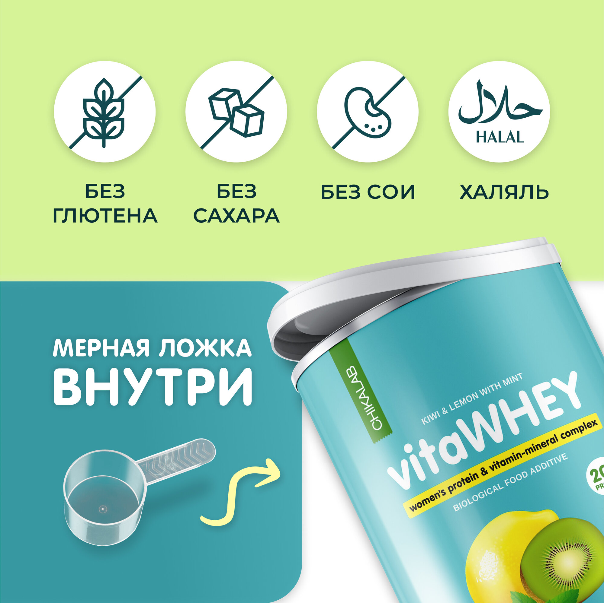 Купить CHIKALAB Протеиновый коктейль без сахара vita WHEY с витаминами и минералами "Киви - Лимон - Мята" 462г