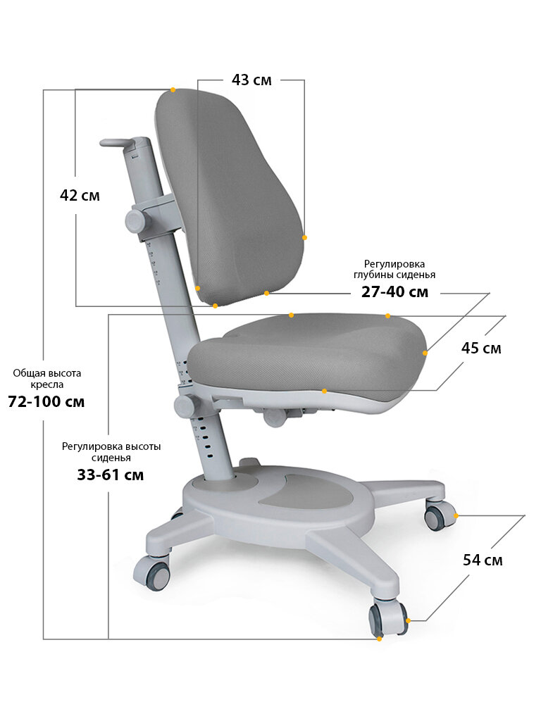 | Плюсы: | Хорошие мягкие колёсики со стоперами. Удобная двидущаяся спинка. Можно сделать низкую высоту сиденья, ноги достают до пола. |