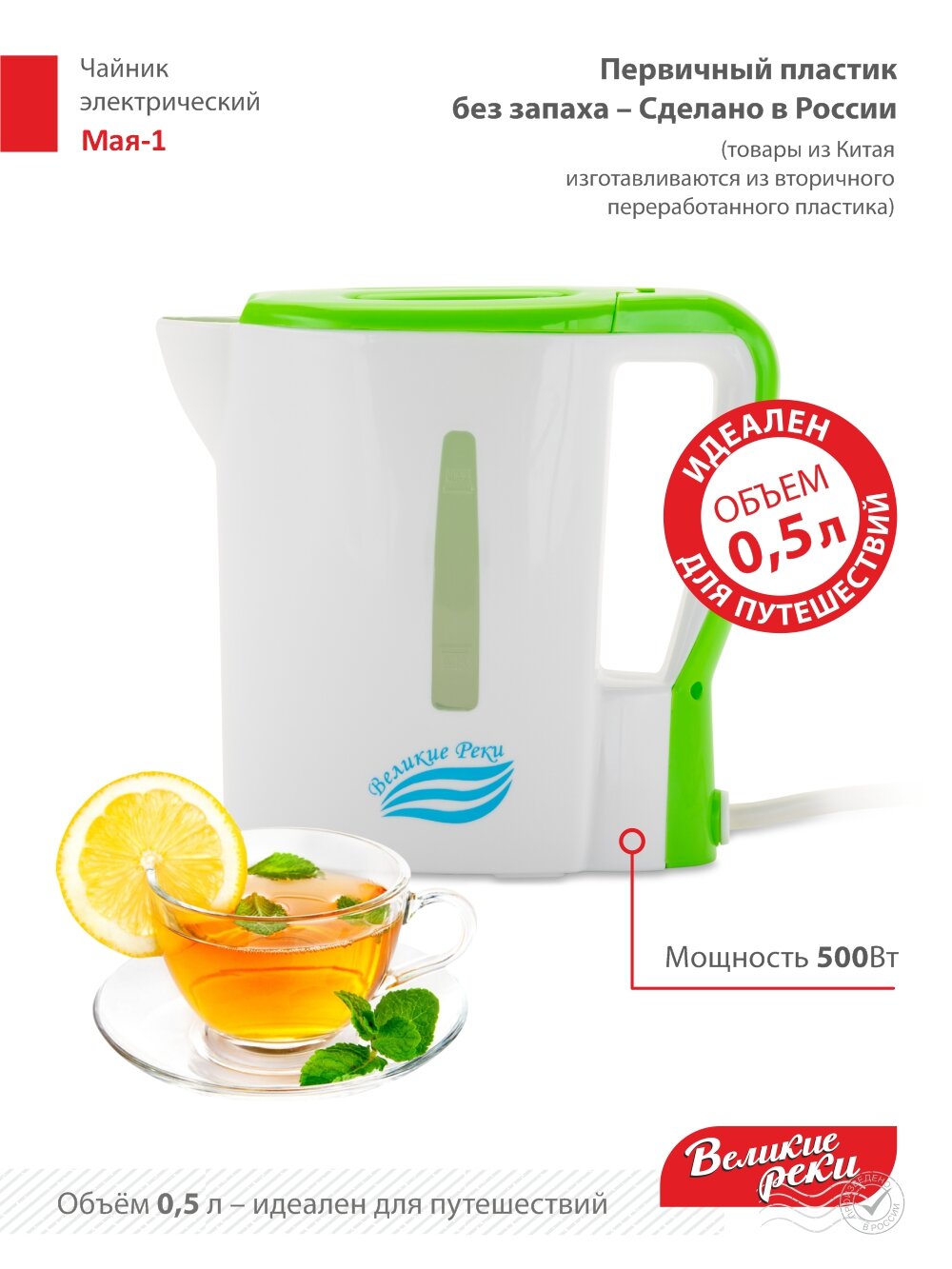 Чайник электрический Великие Реки Мая-1 бело-салатовый, 0,5 л, пластик, 500 Вт