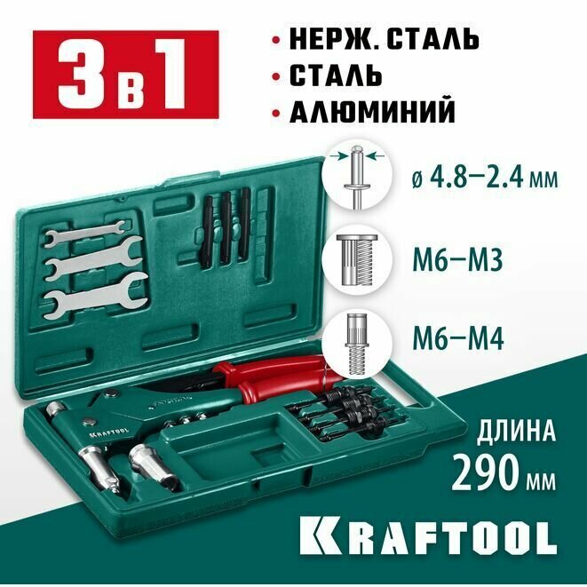Заклепочник 31178_z01, KRAFTOOL резьбовые заклепки М3-М6, вытяжные 2.4-4.8 мм - алюминий, сталь, нерж. сталь. интересное: