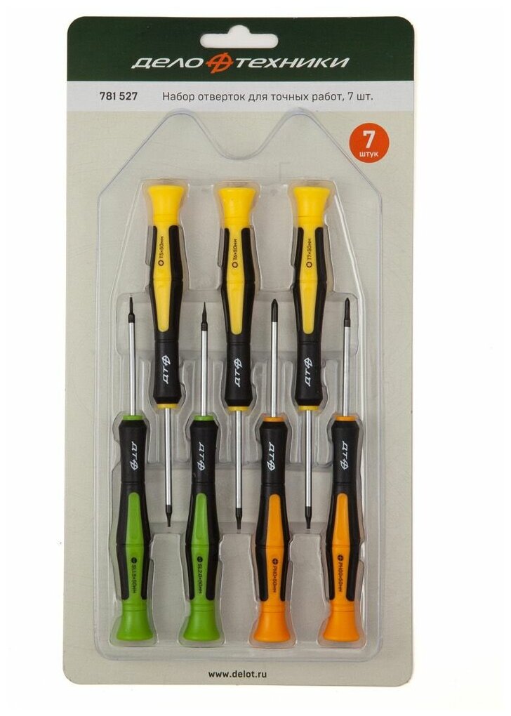 Набор отверток ручных Дело техники, для точных работ, 781527, желтый, зеленый, оранжевый, серебристый, черный, 7 шт
