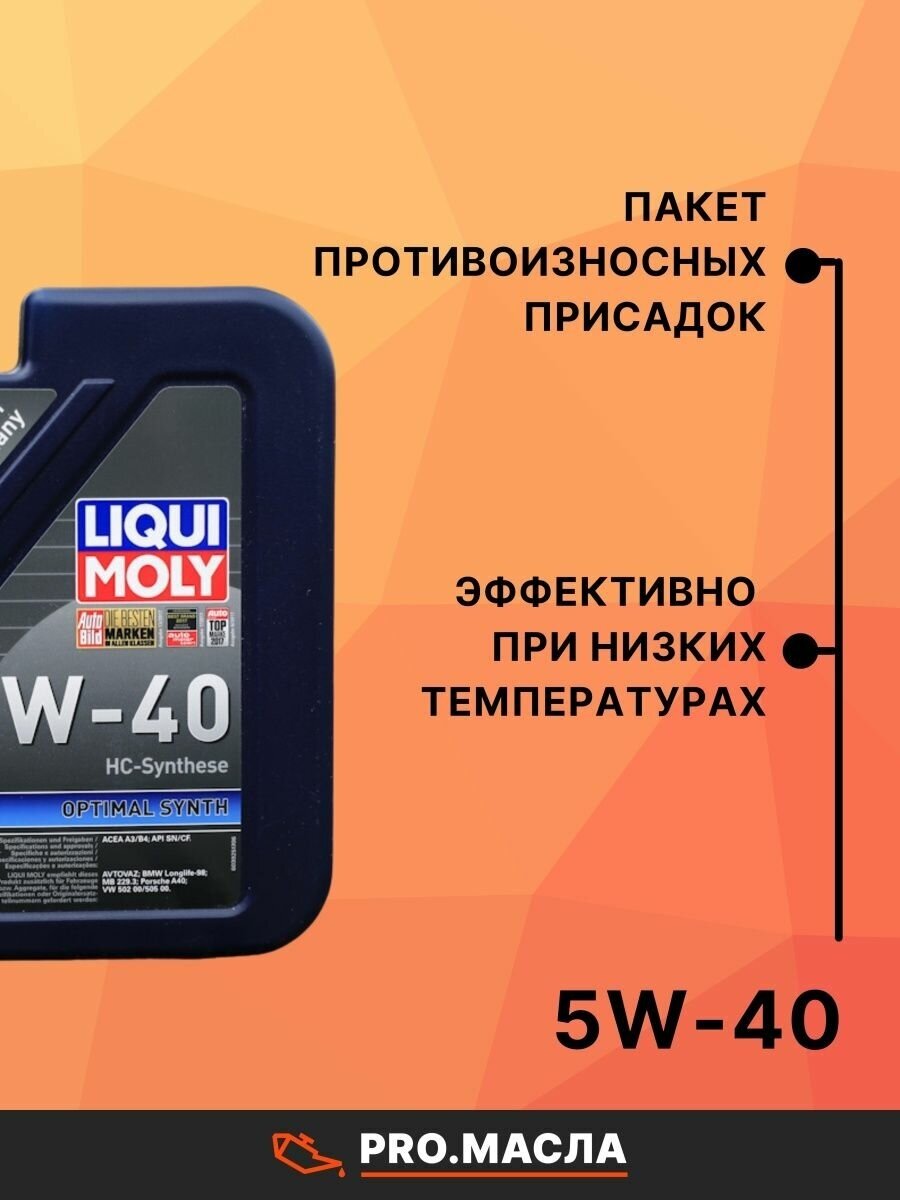 Масло моторное Liqui Moly Optimal Synth 5w40 синтетическое, API SN/CF, ACEA A3/B4, универсальное, 1л, арт. 3925