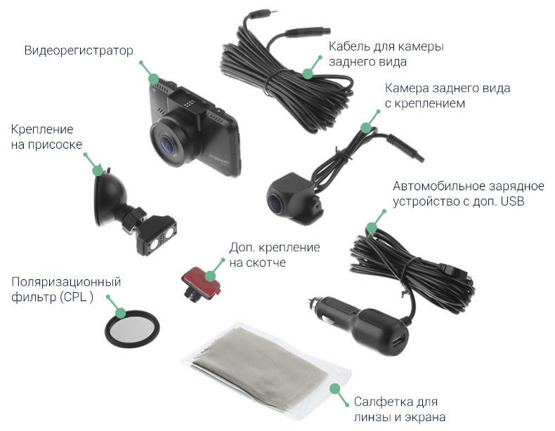 Комплектация включает 2 камеры; разрешение у обеих камер full hd, нет такого, что задняя идёт в наборе довеском; хорошее сжатие файлов; радар в камерах контроля не путается.