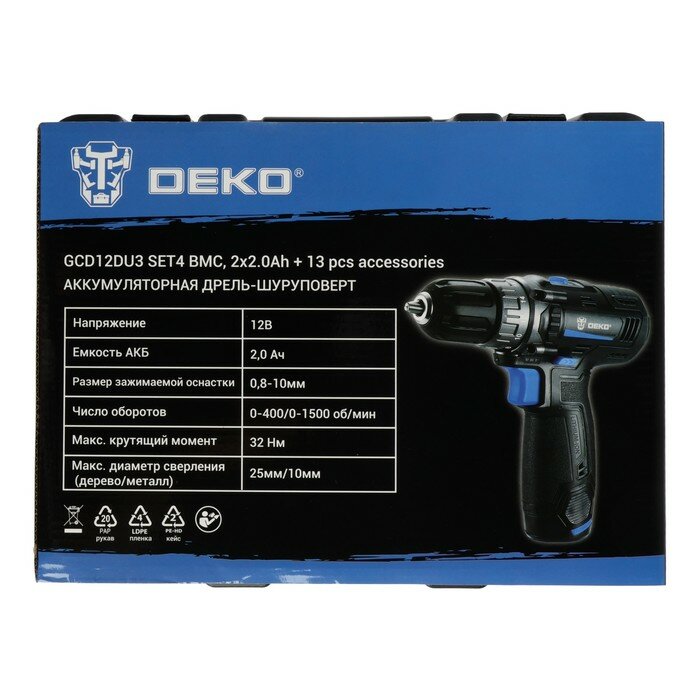Дрель-шуруповерт аккумуляторный Deko GCD12DU3 SET 4 в кейсе + оснастка 13 шт, 2*2 А·ч [063-4140]