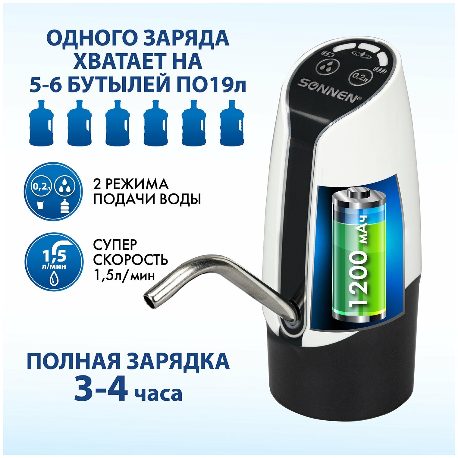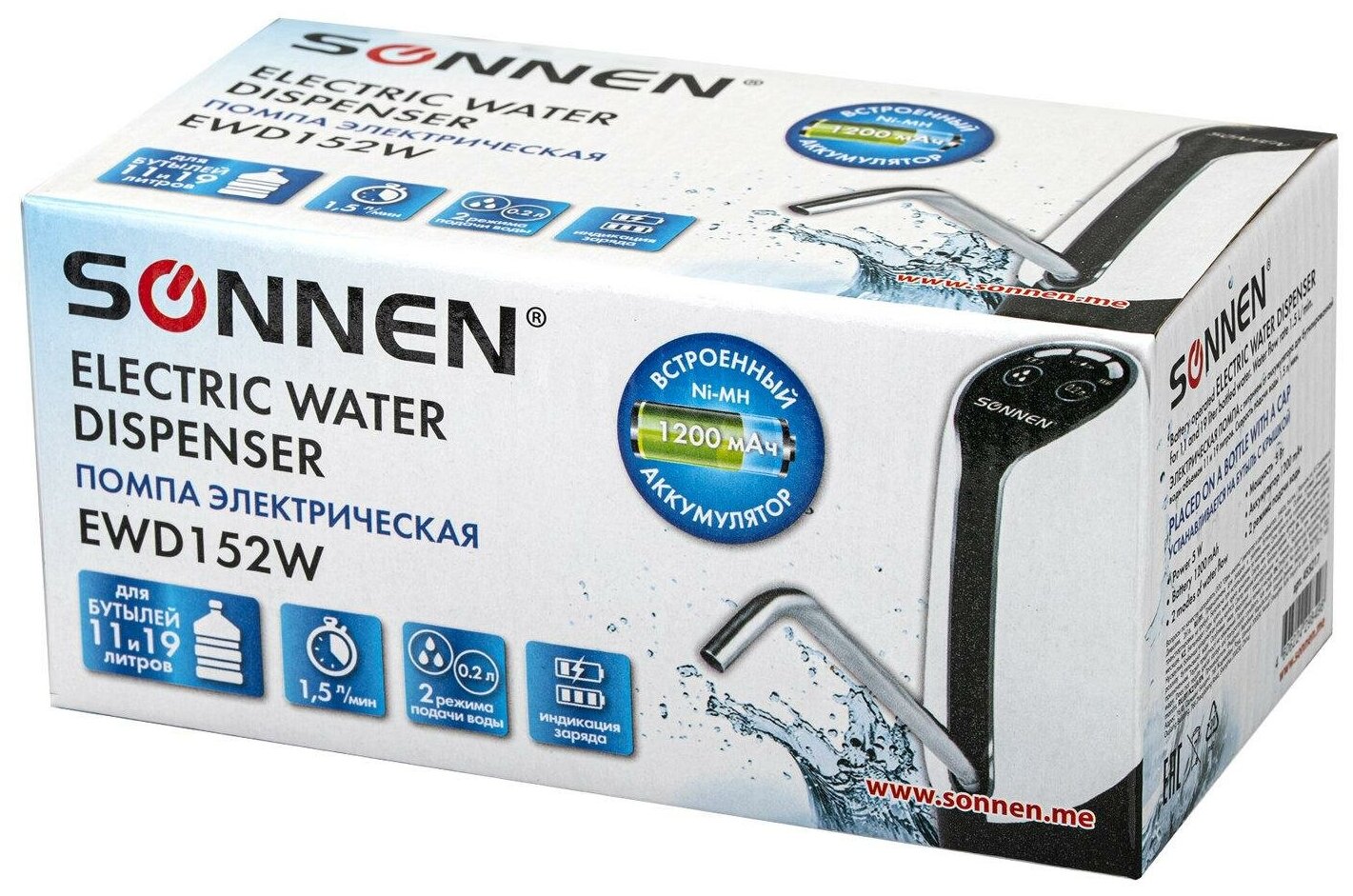 Помпа для воды электрическая SONNEN EWD152W, 1.5 л/мин, 2 режима, аккумулятор, адаптер, пластик