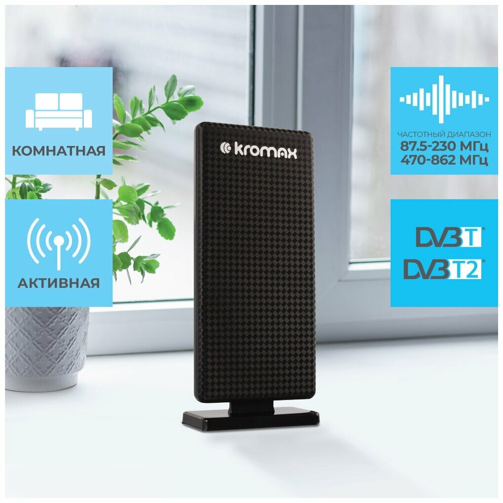 Антенна Kromax TV FLAT-09, комнатная,активная, с усилителем, 20 дБи, DVB-T2, цифровая,черная