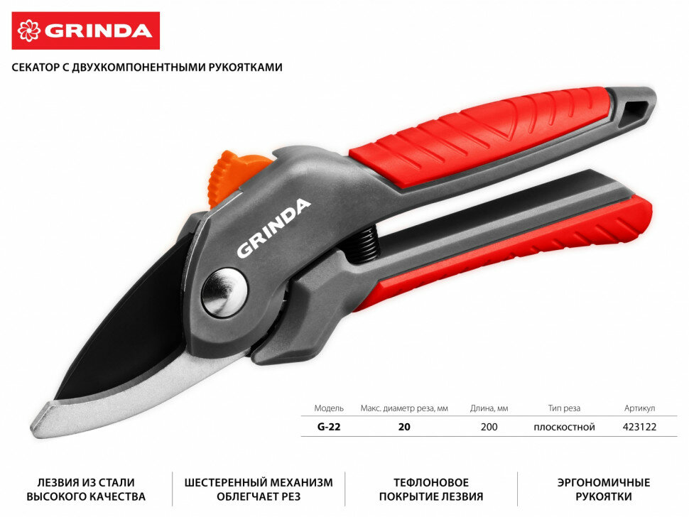 GRINDA G-22 Секатор с двухкомпонентными рукоятками, плоскостной, 200 мм, GRINDA, ( 423122 ) интересное: