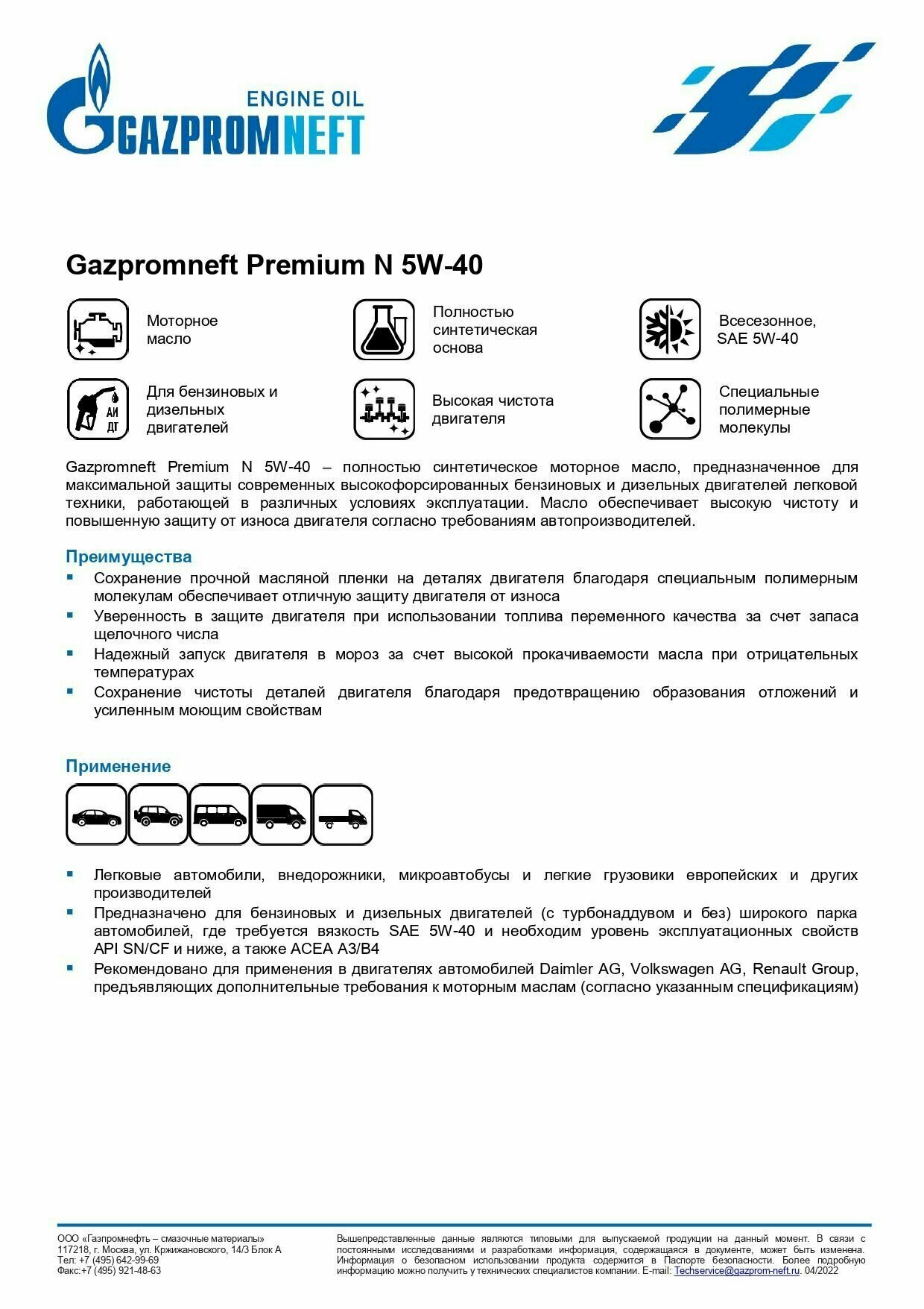 Масло моторное GAZPROMNEFT Premium N 5W-40 SN/CF A3/B4 синтетическое 1 л GAZPROMNEFT 2389900143 | цена за 1 шт