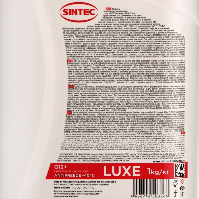 Antifreeze Sintec Luxe G12+Red (-40) 1Кг SINTEC арт. 990550