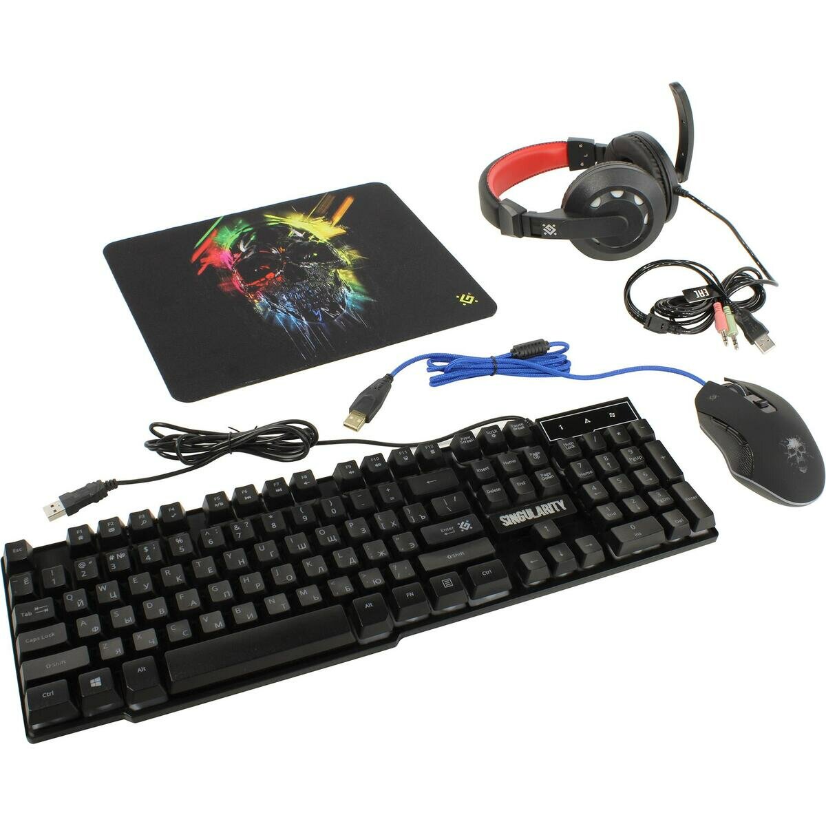 Клавиатура и мышь игровые Defender Singularity MKP-118 комплект с подсветкой + игровой коврик+гарнитура - черные