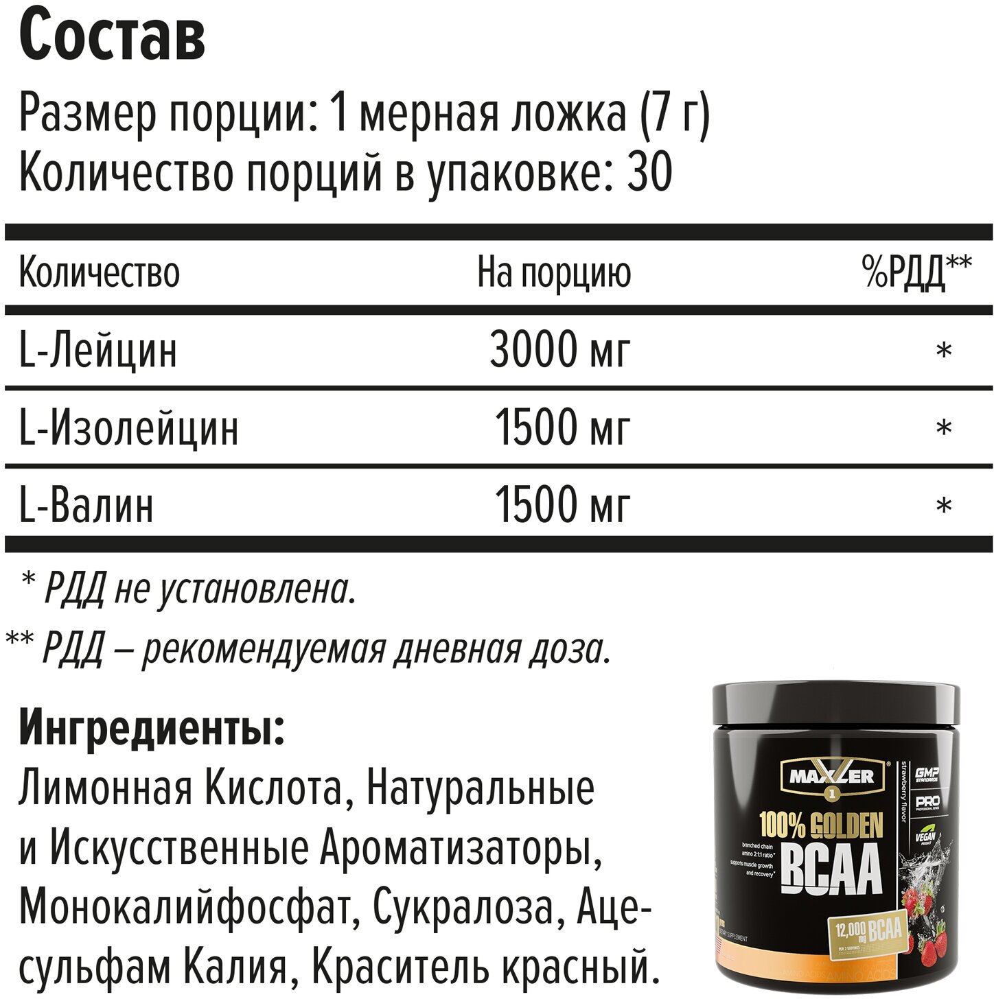 Аминокислоты Maxler 100% Golden BCAA Клубника, 210г, БЦАА в соотношении 2:1:1, В форме порошка, 30 порций