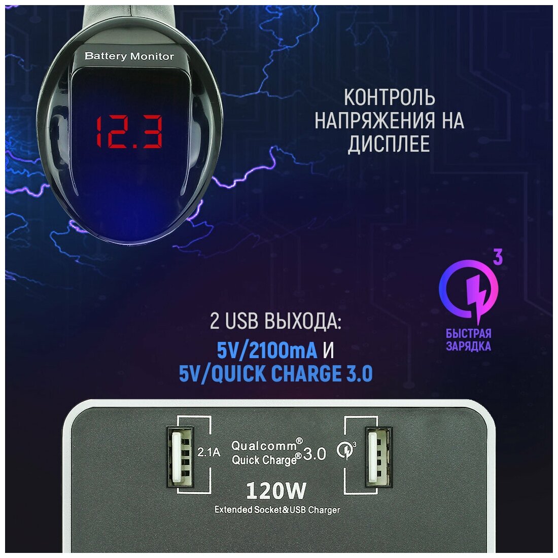 Купить Разветвитель прикуривателя 12/24V на 3 гнезда 120W и 2USB разъема 5V-3.0А, 2.1А, вольтметр