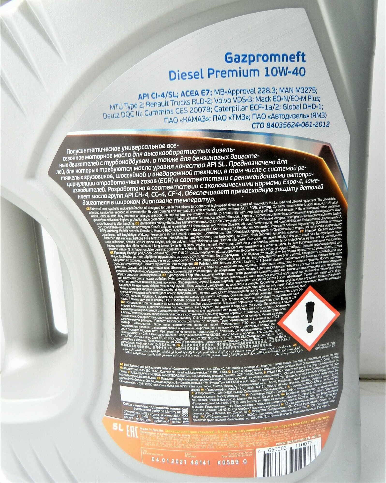 GAZPROMNEFT 2389901340 Масло Gazpromneft 10W40 Diesel Premium API CL-4/SL ACEA E7 5л п/с