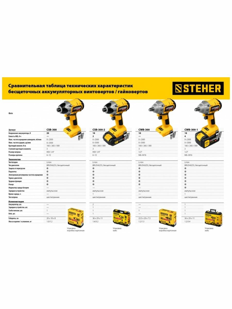 STEHER 20В, Li-Ion, без АКБ, в коробке, бесщеточный, аккумуляторный винтоверт ударный CSB-300