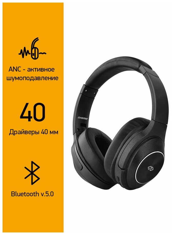 Гарнитура Digma BT-20 ANC, Bluetooth, накладные, черный