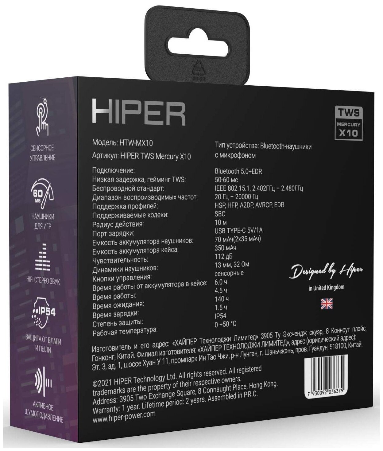 Беспроводные наушники HIPER TWS Mercury X10 (HTW-MX10) Bluetooth 5.0 гарнитура, Черный