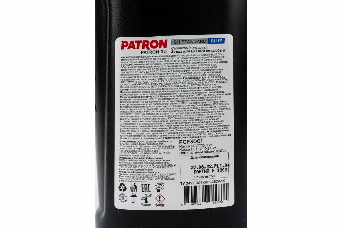 PATRON PCF3001 Антифриз 1кг брутто (0.87л) синий готовый, PATRON BLUE G11, TL 774-C, G011A8CA1, 83512355290, N600690, MAN 324 NF, MB 325.0, B0400240, 6901599, 1286083